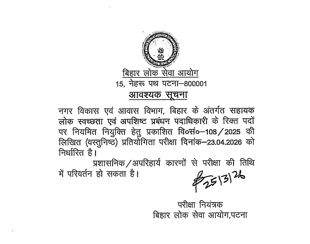 Exam Date Announced: BPSC – Assistant Public Sanitary & Waste Management Officer under Urban Development & Housing Dept., Govt. of Bihar (Advt. No. 108/2025)⌛ | Exam Assure Classes