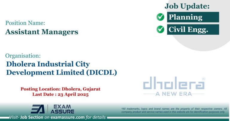 Vacancy for Assistant Managers at Dholera Industrial City Development Limited (DICDL) | Posting Location: Dholera, Gujarat (Last Date : 23 April 2025)