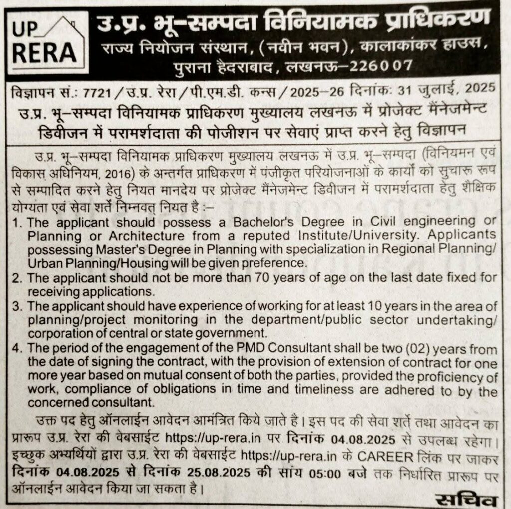 Vacancy for Consultant at Uttar Pradesh Real Estate Regulatory Authority (UP RERA)