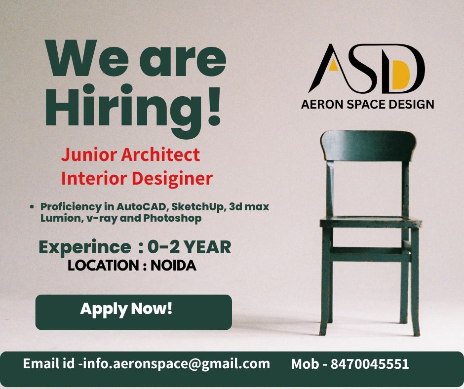 Vacancy for Junior Architect & Interior Designer at Aeron Space Design | Posting Location: Noida (Exp.: 0-2 Years)By Exam Assure Team / May 21, 2025 Online Live CourseLAST BATCH DDA 2025 Vacancies Classes from 21 Oct. 2025 View Details GATE AR 2026 Classes from 21 Oct. 2025 View Details Exam Assure updates regularly on WhatsAppJoin WhatsApp GroupJoin NowJoin us on Social media:InstagramfacebookTelegramLinkedIn Vacancy for Junior Architect & Interior Designer at Aeron Space DesignPositions: