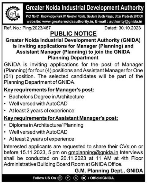 Vacancy for Manager and Assistant Manager at Greater Noida Industrial Development Authority (GNIDA)