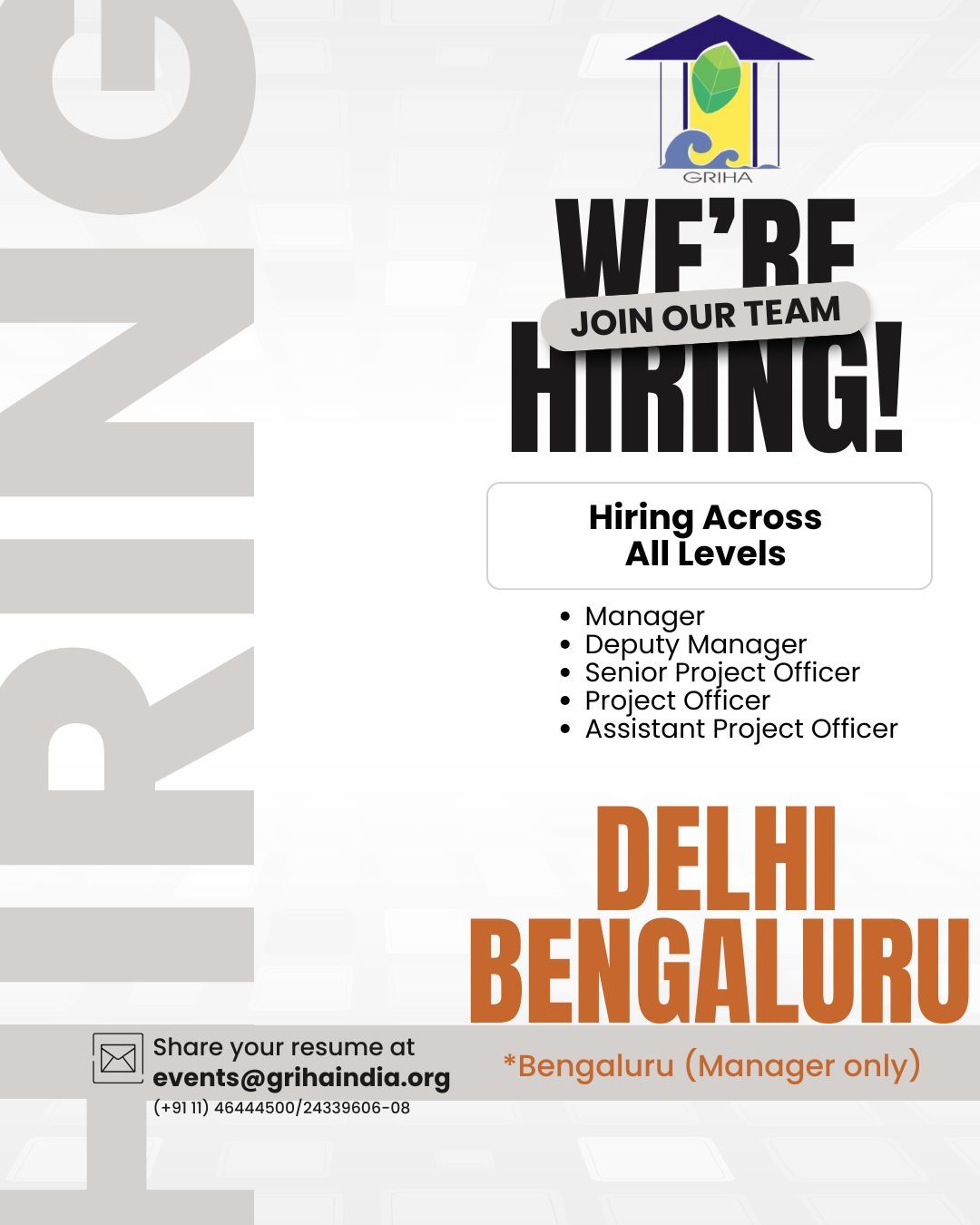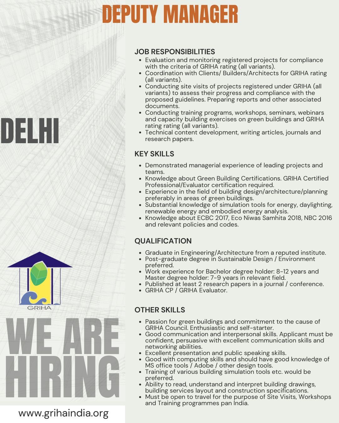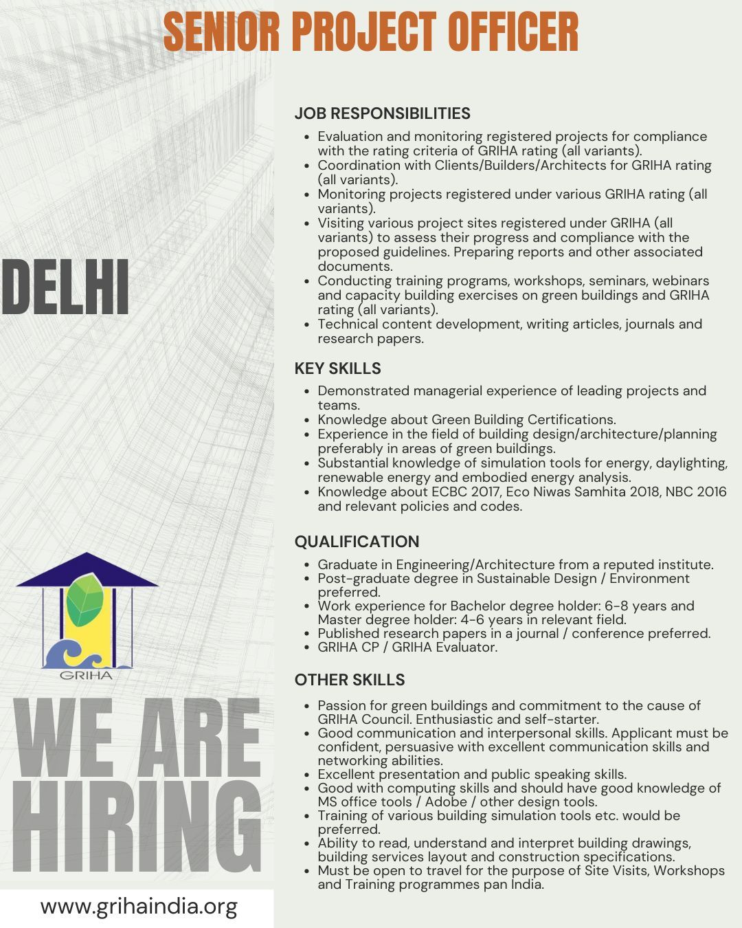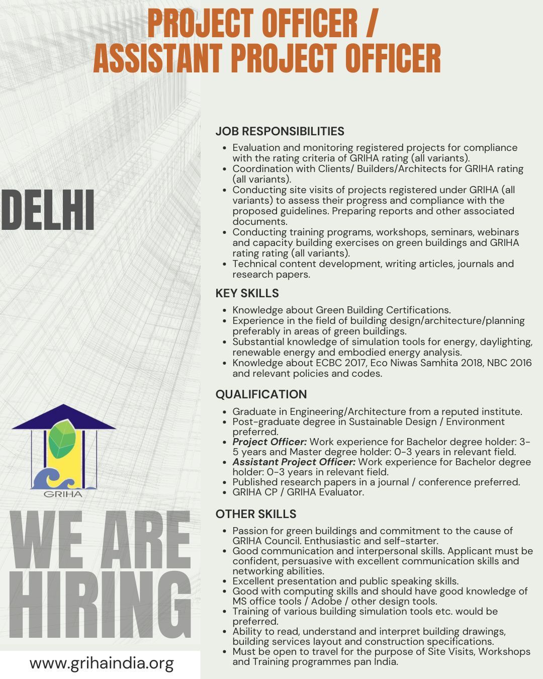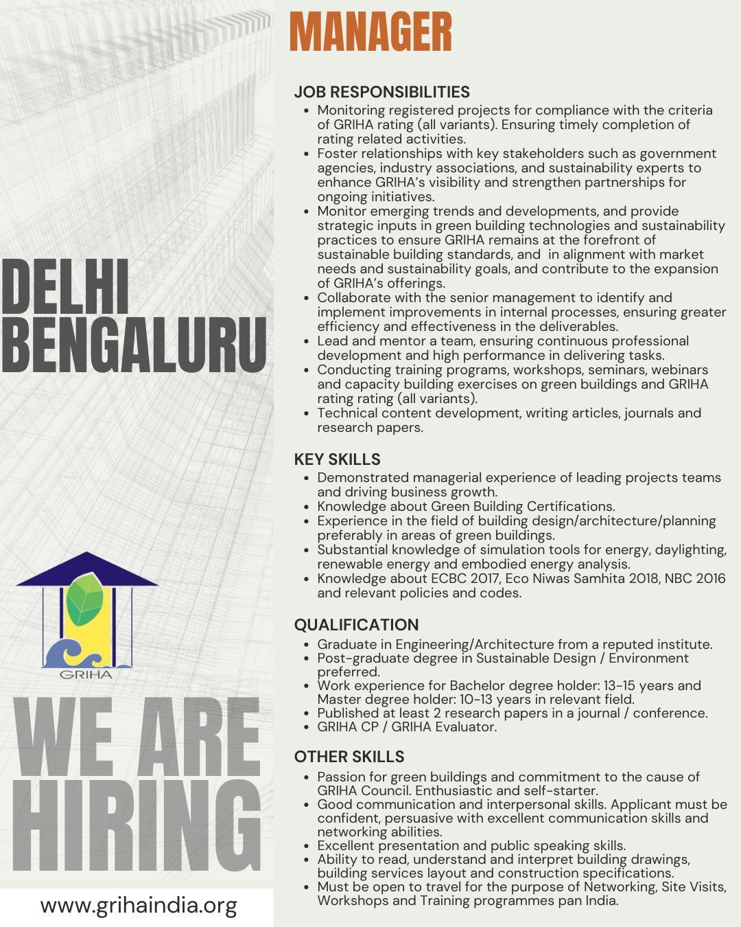Vacancy for Multiple Positions (Managers, Sr. Project Officer, etc.) at GRIHA Council | Posting Location: New Delhi & Bengaluru (Experience: 0-15 Years)By Exam Assure Team / July 30, 2025 Online Live CourseLAST BATCH DDA 2025 Vacancies Classes from 21 Oct. 2025 View Details GATE AR 2026 Classes from 21 Oct. 2025 View Details Exam Assure updates regularly on WhatsAppJoin WhatsApp GroupJoin NowJoin us on Social media:InstagramfacebookTelegramLinkedIn Vacancy for Multiple Positions at GRIHA Council1. ManagerPositions: