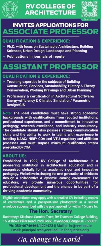 Vacancy for Associate Professor and Assistant Professor at RV College of Architecture (RVCA)