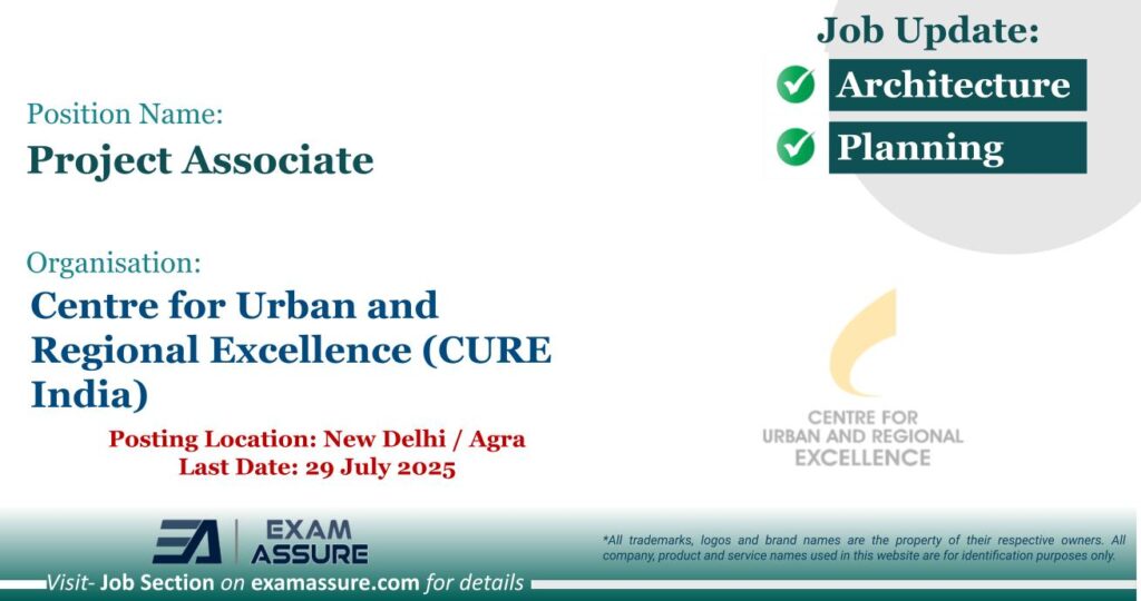Vacancy for Project Associate at Centre for Urban and Regional Excellence (CURE India) | Posting Location: New Delhi / Agra (Last Date: 29 July 2025)By Exam Assure Team / July 28, 2025 Online Live CourseLAST BATCH DDA 2025 Vacancies Classes from 21 Oct. 2025 View Details GATE AR 2026 Classes from 21 Oct. 2025 View Details Exam Assure updates regularly on WhatsAppJoin WhatsApp GroupJoin NowJoin us on Social media:InstagramfacebookTelegramLinkedIn Vacancy for Project Associate at Centre for Urban and Regional Excellence (CURE India)Positions: