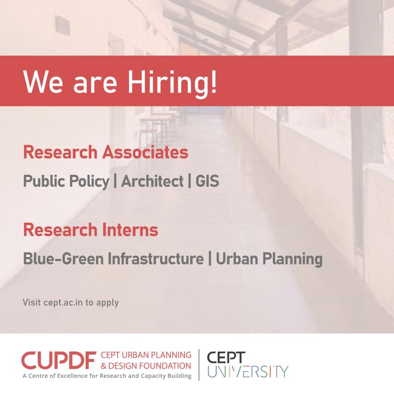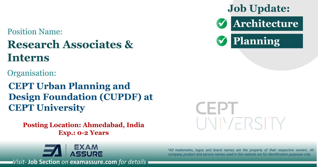 Vacancy for Research Associates & Interns at CEPT Urban Planning and Design Foundation (CUPDF) at CEPT University | Posting Location: Ahmedabad, India (Exp.: 0-2 Years)By Exam Assure Team / July 10, 2025 Online Live CourseLAST BATCH DDA 2025 Vacancies Classes from 21 Oct. 2025 View Details GATE AR 2026 Classes from 21 Oct. 2025 View Details Exam Assure updates regularly on WhatsAppJoin WhatsApp GroupJoin NowJoin us on Social media:InstagramfacebookTelegramLinkedIn Vacancy for Research Associates & Interns at CEPT Urban Planning and Design Foundation (CUPDF) at CEPT University1.